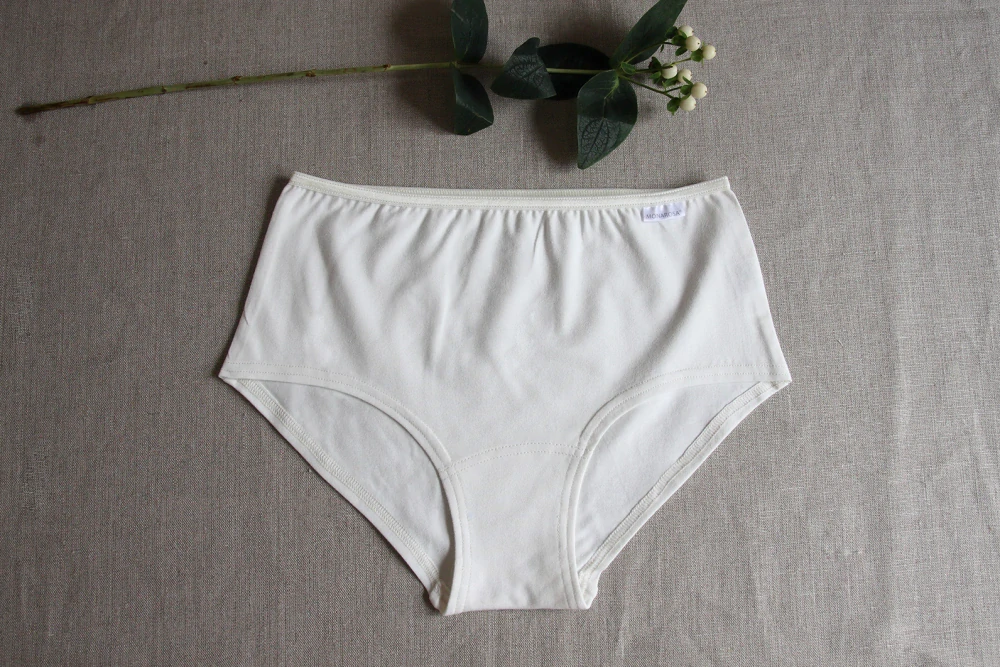 Dámské kalhotky z kvalitního organického bavlněného úpletu v krémové barvě. Střih je krásně ženský, vysoký až do pasu, kde ho lemuje pruženka s leskem a vytváří tak krasný minimalistický detail.