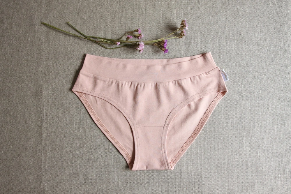 Dámské kalhotky z kvalitního organického bavlněného úpletu v pudrově růžové barvě, velmi příjemné na omak. STŘIH VÍCE VYKROJENÝ NA BOCÍCH oproti mému obvyklému střihu.