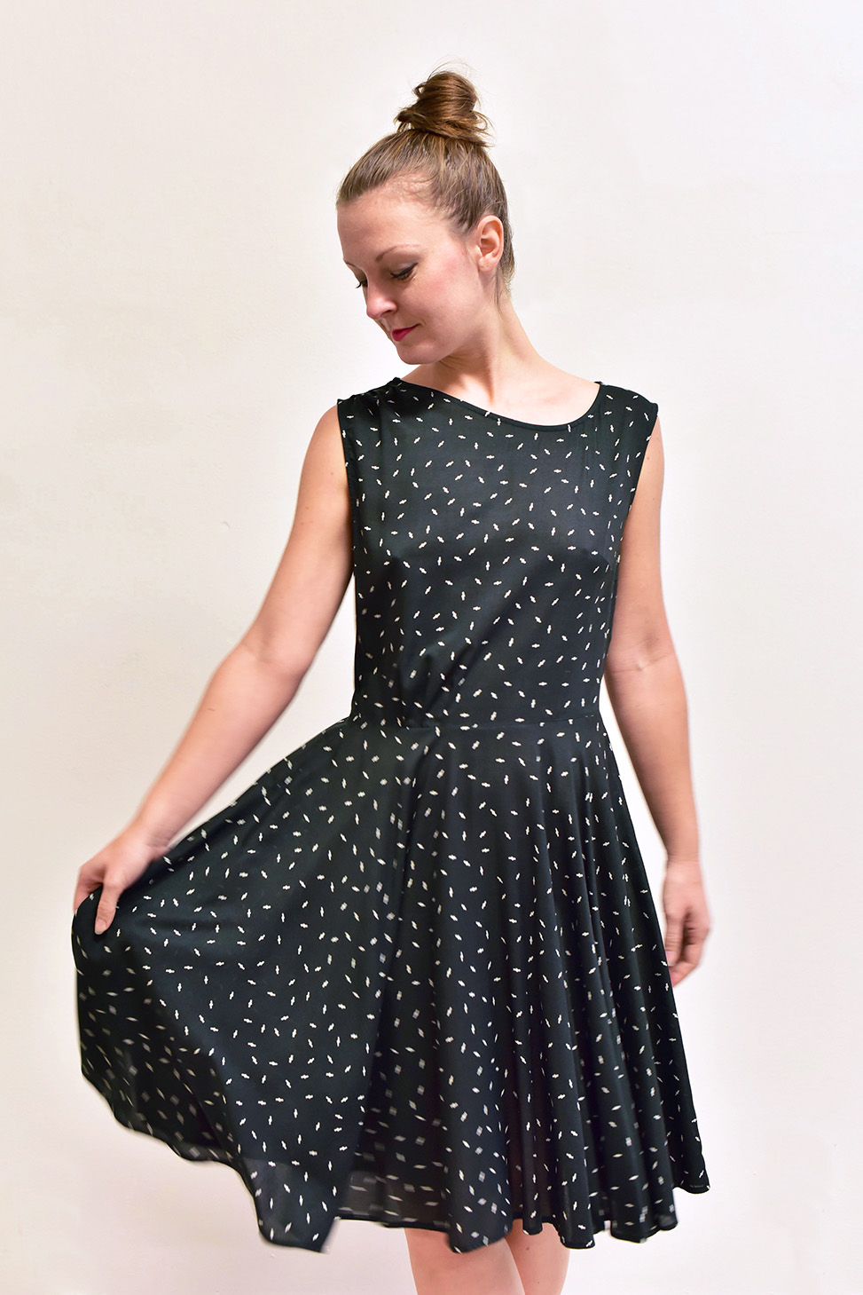 Něžné šaty s kolovou sukní jsou vyrobené z jemného splývavého viskózového batistu. Látka je potištěna drobným motivem - PIEROT - a patří do kolekce DELL'ARTE.