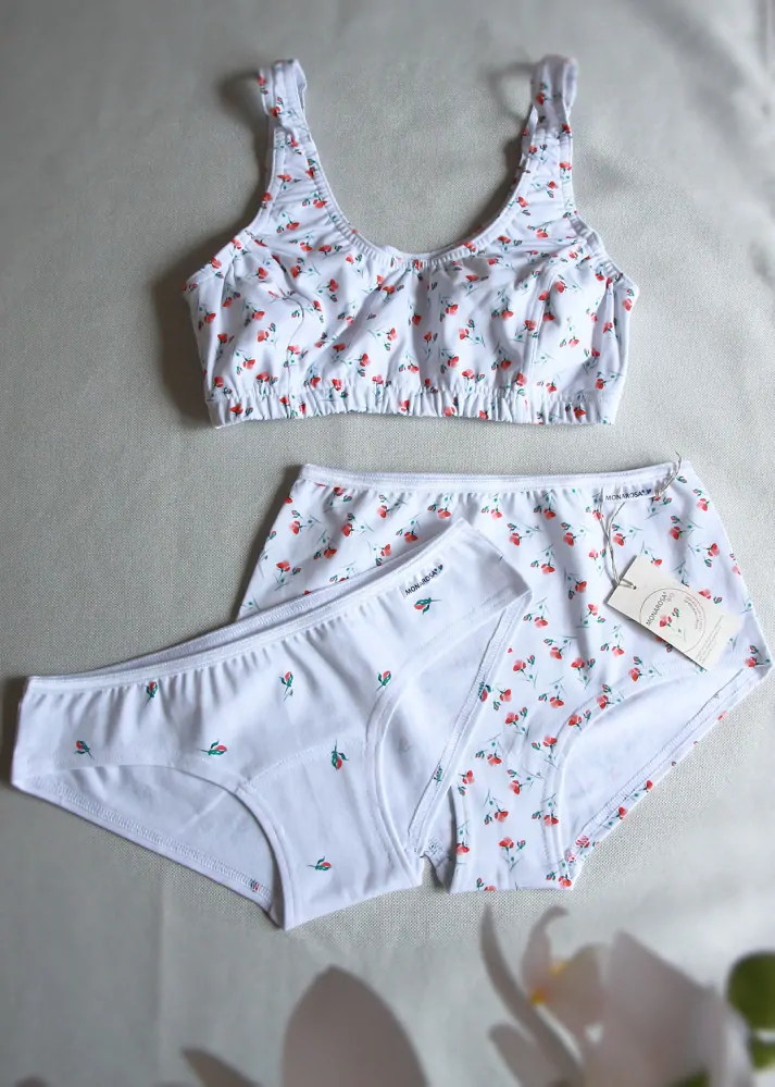 Podprsenka a kalhotky z organické bavlny s jedinečným autorským potiskem malovaných květin na bílém podkladu. Potisk vznikl ve spolupráci s akademickou malířkou Markétou Šafárikovou.