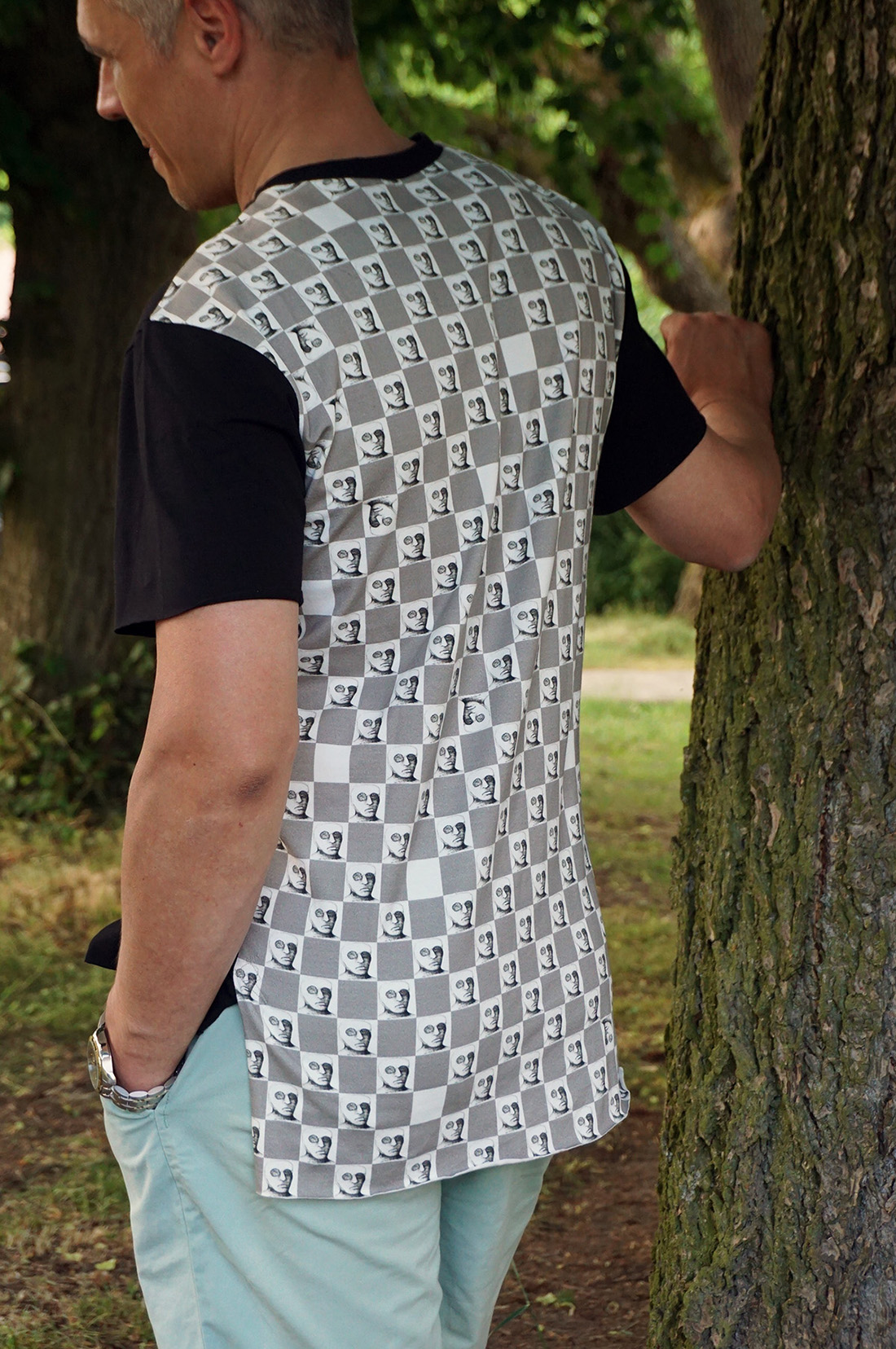 Triko je vyrobeno z kvalitních bavlněných úpletů. Přední díl, rukávy a lem průkrčníku je jednobarevný, zadní díl je z naší autorské látky s rozehraným potiskem šachovnice a s kresbami hlavy. Díky nápaditému členění jsou na tričku vytvořené rozparky, které zdobí asymetrické prošívání. Dolní kraje nejsou začištěné, necháváme zde prostor látce, ať se chová, jak je pro ni přirozené. Nepáře se!